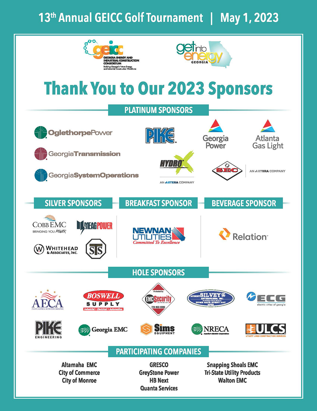 Home Who We Are About Get Into Energy Georgia About GEICC Membership Partnerships and Alliances Energy Training and Events Careers in Energy Week Energy Training GEICC Golf Tournament GEICC Resources GEICC Scholarships GEICC Upcoming Dates Energy Careers Troops to Energy Jobs Get Into Energy Contact Us The 16th Annual GEICC Golf Tournament Monday, April 27, 2026 The Georgia Club1050 Chancellors DriveStatham, GA 30666 Thank you to our2025 sponsors! FollowFollowFollowFollow © Copyright 2025, Georgia Energy and Industrial Construction Consortium